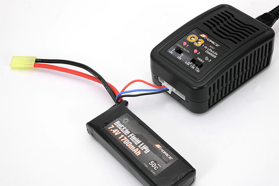 G-FORCE G3 CHARGER 充電器(LiPo/LiFe対応)LiPo・LiFe充電はこれ1台でOK! 簡単操作&AC 100V ![]() ラベルに技アリ! もう迷わない!推奨設定を本体に明記! 基本機能シンプルな操作性を実現! LiPo/LiFe 両対応! AC専用カンタン充電器! 充電電流を3 段階に切替え可能!(0.5A/1.0A/1.5A) 対応セル数:1S ~ 3S (LiPo/LiFe 共通) コネクター差込口:JST-XH ※タミヤ製LiFeの充電には別途タミヤLiFe変換コネクタ(G0026)が必要です。 PSE 認証取得済み 使用例![]() 各部名称![]() 同梱物![]() 充電器 ×1 電源ケーブル ×1 日本語マニュアル ×1